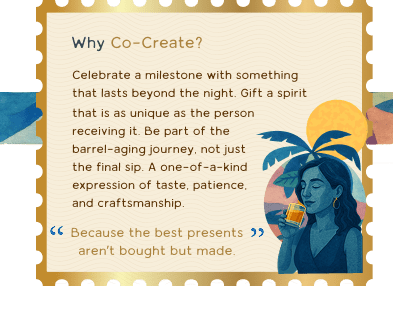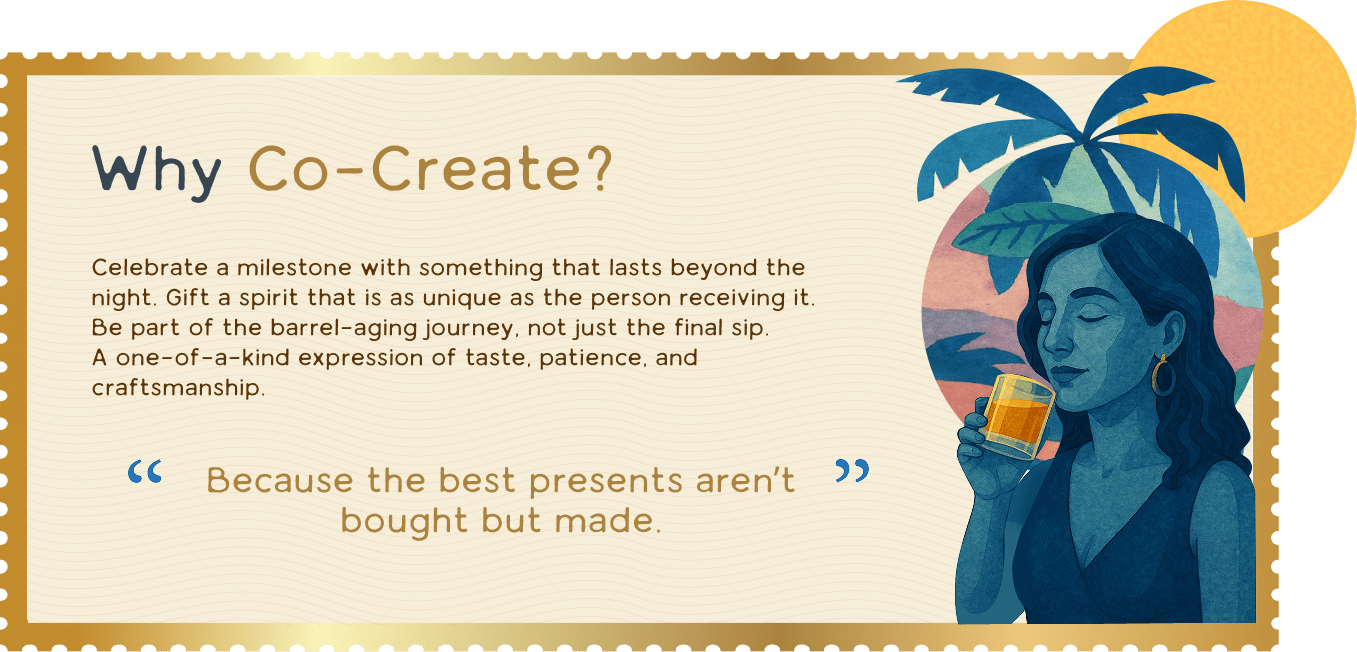 You will collaborate with our Founder Karun and his team of master distillers to bring your personal vision to life: From selecting the flavor profile to choosing your barrel type and aging style: American oak for warm vanilla notes, French oak for spice and depth, or used wine and whiskey barrels for layered complexity.